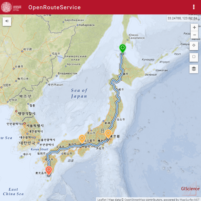 宗谷岬から皇居と京都御所を経由して佐多岬まで OpenRouteService で経路検索1 | OpenRouteService で世界中の経路検索ができます。