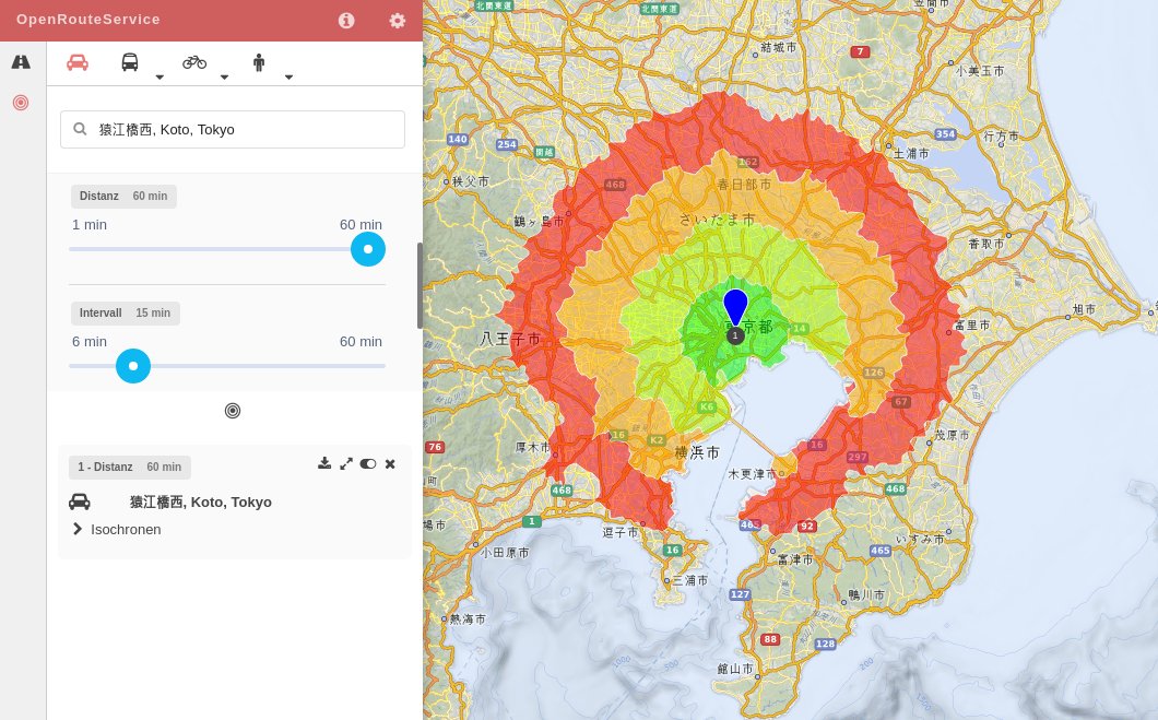 • [1] OpenRouteService は新しい API、新しい機能(指定した時間内で移動可能なエリアを計算するアイソクロナス計算など)と改良されたインターフェイスになっています。