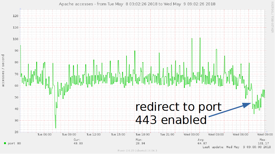 The Munin access graph for Apache on ironbelly.openstreetmap.org shows a decline in the number of requests after the redirect on port 443 was enabled. 1 | Image: munin.openstreetmap.org